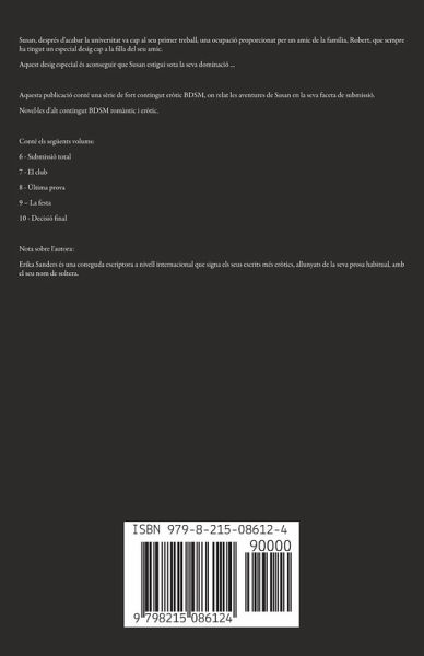 Susan, després d'acabar la universitat va cap al seu primer treball, una ocupació proporcionat per un amic de la família, Robert, que sempre ha tingut un especial desig cap a la filla del seu amic. Aquest desig especial és aconseguir que Susan estigui sota la seva dominació ... Aquesta publicació conté una sèrie de fort contingut eròtic BDSM, on relat les aventures de Susan en la seva faceta de submissió. Novel·les d'alt contingut BDSM romàntic i eròtic. Conté els següents volums: 6 - Submissió total 7 - El club 8 - Última prova 9 – La festa 10 - Decisió final Nota sobre l'autora: Erika Sanders és una coneguda escriptora a nivell internacional que signa els seus escrits més eròtics, allunyats de la seva prosa habitual, amb el seu nom de soltera.
