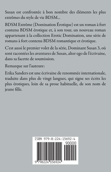 Susan est confrontée à bon nombre des éléments les plus extrêmes du style de vie BDSM... BDSM Extrême (Domination Érotique) est un roman à fort contenu BDSM érotique et, à son tour, un nouveau roman appartenant à la collection Erotic Domination, une série de romans à fort contenu BDSM romantique et érotique. C'est aussi le premier volet de la série, Dominant Susan 3, où sont racontées les aventures de Susan, alter ego de l'écrivaine, dans sa facette de soumission. Remarque sur l'auteure: Erika Sanders est une écrivaine de renommée internationale, traduite dans plus de vingt langues, qui signe ses écrits les plus érotiques, loin de sa prose habituelle, de son nom de jeune fille.