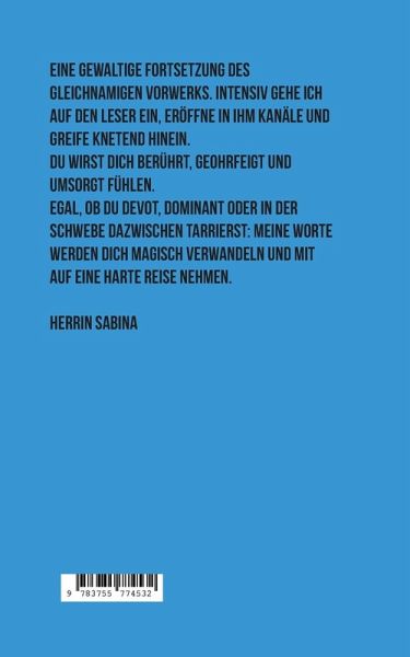 Eine gewaltige Fortsetzung des gleichnamigen Vorwerks. Intensiv gehe ich auf den Leser ein, eröffne in ihm Kanäle und greife knetend hinein. Du wirst Dich berührt, geohrfeigt und umsorgt fühlen. Egal, ob Du devot, dominant oder in der Schwebe dazwischen tarrierst: Meine Worte werden Dich magisch verwandeln und mit auf eine harte Reise nehmen. Herrin Sabina
