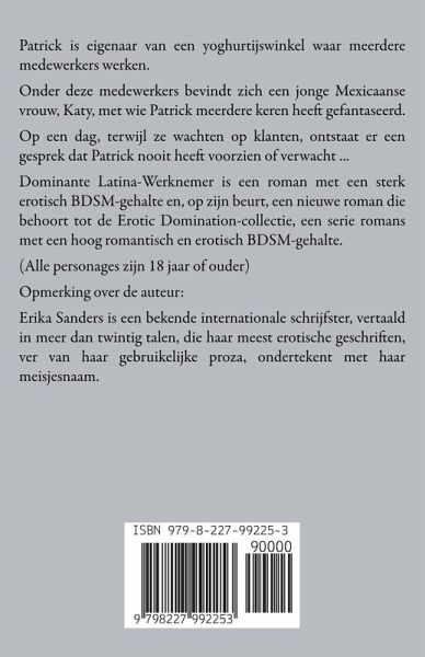 Patrick is eigenaar van een yoghurtijswinkel waar meerdere medewerkers werken. Onder deze medewerkers bevindt zich een jonge Mexicaanse vrouw, Katy, met wie Patrick meerdere keren heeft gefantaseerd. Op een dag, terwijl ze wachten op klanten, ontstaat er een gesprek dat Patrick nooit heeft voorzien of verwacht ... Dominante Latina-Werknemer is een roman met een sterk erotisch BDSM-gehalte en, op zijn beurt, een nieuwe roman die behoort tot de Erotic Domination-collectie, een serie romans met een hoog romantisch en erotisch BDSM-gehalte. (Alle personages zijn 18 jaar of ouder) Opmerking over de auteur: Erika Sanders is een bekende internationale schrijfster, vertaald in meer dan twintig talen, die haar meest erotische geschriften, ver van haar gebruikelijke proza, ondertekent met haar meisjesnaam.