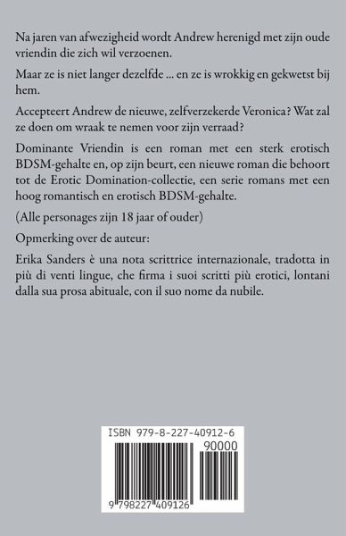 Na jaren van afwezigheid wordt Andrew herenigd met zijn oude vriendin die zich wil verzoenen. Maar ze is niet langer dezelfde ... en ze is wrokkig en gekwetst bij hem. Accepteert Andrew de nieuwe, zelfverzekerde Veronica? Wat zal ze doen om wraak te nemen voor zijn verraad? Dominante Vriendin is een roman met een sterk erotisch BDSM-gehalte en, op zijn beurt, een nieuwe roman die behoort tot de Erotic Domination-collectie, een serie romans met een hoog romantisch en erotisch BDSM-gehalte. (Alle personages zijn 18 jaar of ouder) Opmerking over de auteur: Erika Sanders è una nota scrittrice internazionale, tradotta in più di venti lingue, che firma i suoi scritti più erotici, lontani dalla sua prosa abituale, con il suo nome da nubile.
