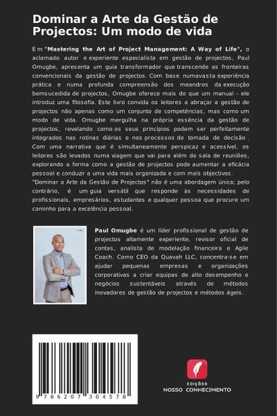 Em "Mastering the Art of Project Management: A Way of Life", o aclamado autor e experiente especialista em gestão de projectos, Paul Omugbe, apresenta um guia transformador que transcende as fronteiras convencionais da gestão de projectos. Com base numavasta experiência prática e numa profunda compreensão dos meandros da execução bemsucedida de projectos, Omugbe oferece mais do que um manual - ele introduz uma filosofia. Este livro convida os leitores a abraçar a gestão de projectos não apenas como um conjunto de competências, mas como um modo de vida. Omugbe mergulha na própria essência da gestão de projectos, revelando como os seus princípios podem ser perfeitamente integrados nas rotinas diárias e nos processos de tomada de decisão . Com uma narrativa que é simultaneamente perspicaz e acessível, os leitores são levados numa viagem que vai para além da sala de reuniões, explorando a forma como a gestão de projectos pode aumentar a eficácia pessoal e conduzir a uma vida mais organizada e com mais objectivos."Dominar a Arte da Gestão de Projectos" não é uma abordagem única; pelo contrário, é um guia versátil que responde às necessidades de profissionais, empresários, estudantes e qualquer pessoa que procure um caminho para a excelência pessoal.