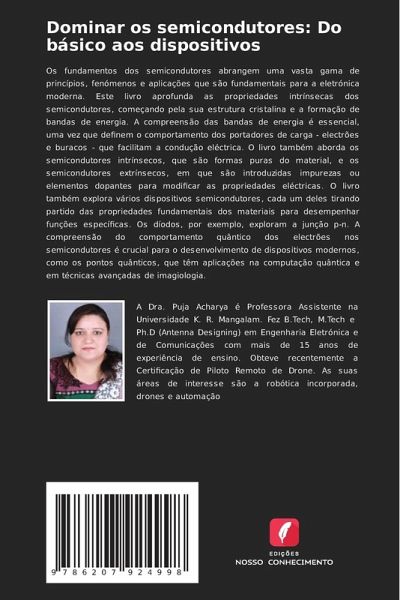 Os fundamentos dos semicondutores abrangem uma vasta gama de princípios, fenómenos e aplicações que são fundamentais para a eletrónica moderna. Este livro aprofunda as propriedades intrínsecas dos semicondutores, começando pela sua estrutura cristalina e a formação de bandas de energia. A compreensão das bandas de energia é essencial, uma vez que definem o comportamento dos portadores de carga - electrões e buracos - que facilitam a condução eléctrica. O livro também aborda os semicondutores intrínsecos, que são formas puras do material, e os semicondutores extrínsecos, em que são introduzidas impurezas ou elementos dopantes para modificar as propriedades eléctricas. O livro também explora vários dispositivos semicondutores, cada um deles tirando partido das propriedades fundamentais dos materiais para desempenhar funções específicas. Os díodos, por exemplo, exploram a junção p-n. A compreensão do comportamento quântico dos electrões nos semicondutores é crucial para o desenvolvimento de dispositivos modernos, como os pontos quânticos, que têm aplicações na computação quântica e em técnicas avançadas de imagiologia.