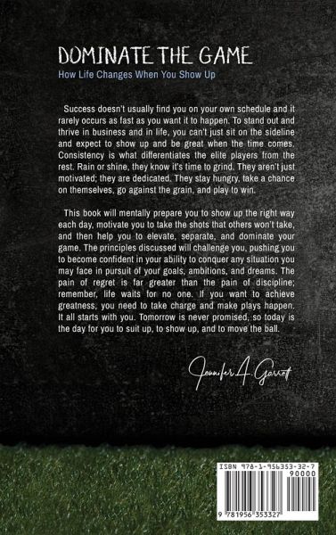 Dominate The Game will mentally prepare you to show up the right way each day, motivate you to take the shots that others won't take, and then help you to elevate, separate, and dominate your game. The principles discussed will challenge you, pushing you to become confident in your ability to conquer any situation you may face in pursuit of your goals, ambitions, and dreams. The pain of regret is far greater than the pain of discipline; remember, life waits for no one. If you want to achieve greatness, you need to take charge and make plays happen. It all starts with you. Dominate the Game is a complementary book to Jennifer A. Garrett's book, Move the Ball, a personal growth book that has been recognized across the globe. Move the Ball is a book focused on preparing vision, strategies, playbooks, blueprints, and game plans to accomplish your goals and priorities in business, in your career, and in life. Dominate the Game focuses on elevation, playing to win, a mindset of zero limits, acceleration, stretching oneself, next level, exponential growth and going against the grain to not just "move the ball", but to dominate your game. ¿¿¿Tomorrow is never promised, so today is the day for you to suit up, to show up, and to move the ball.
