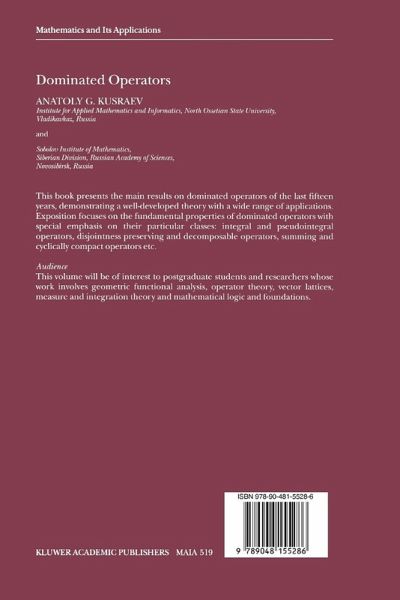 The notion of a dominated or rnajorized operator rests on a simple idea that goes as far back as the Cauchy method of majorants. Loosely speaking, the idea can be expressed as follows. If an operator (equation) under study is dominated by another operator (equation), called a dominant or majorant, then the properties of the latter have a substantial influence on the properties of the former . Thus, operators or equations that have "nice" dominants must possess "nice" properties. In other words, an operator with a somehow qualified dominant must be qualified itself. Mathematical tools, putting the idea of domination into a natural and complete form, were suggested by L. V. Kantorovich in 1935-36. He introduced the funda mental notion of a vector space normed by elements of a vector lattice and that of a linear operator between such spaces which is dominated by a positive linear or monotone sublinear operator. He also applied these notions to solving functional equations. In the succeedingyears many authors studied various particular cases of lattice normed spaces and different classes of dominated operators. However, research was performed within and in the spirit of the theory of vector and normed lattices. So, it is not an exaggeration to say that dominated operators, as independent objects of investigation, were beyond the reach of specialists for half a century. As a consequence, the most important structural properties and some interesting applications of dominated operators have become available since recently.