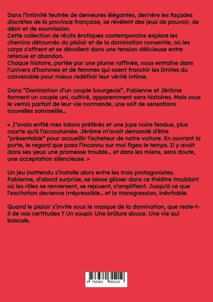 Dans l'intimité feutrée de demeures élégantes, derrière les façades discrètes de la province française, se révèlent des jeux de pouvoir, de désir et de soumission.Cette collection de récits érotiques contemporains explore les chemins détournés du plaisir et de la domination consentie, où les corps s'offrent et se dévoilent dans une tension délicieuse entre retenue et abandon.Chaque histoire, portée par une plume raffinée, nous entraîne dans l'univers d'hommes et de femmes qui osent franchir les limites du convenable pour mieux redéfinir leur vérité intime.Dans "Domination d'un couple bourgeois", Fabienne et Jérôme forment un couple uni, cultivé, apparemment sans histoires. Mais sous le vernis parfait de leur vie normande, une soif de sensations nouvelles sommeille...« J'avais enfilé mes talons préférés et une jupe noire fendue, plus courte qu'à l'accoutumée. Jérôme m'avait demandé d'être "présentable" pour accueillir l'acheteur de notre voiture. En ouvrant la porte, le regard queposa l'inconnu sur moi figea le temps. Il y avait dans ses yeux une promesse trouble... et dans les miens, sans doute, une acceptation silencieuse. »Un jeu inattendu s'installe alors entre les trois protagonistes. Fabienne, d'abord surprise, se laisse glisser dans ce théâtre troublant où les rôles se renversent, se rejouent, s'amplifient. Jusqu'à ce que l'excitation devienne irrépressible... et la transgression, inévitable.Quand le plaisir s'invite sous le masque de la domination, que reste-t-il de nos certitudes ? Un soupir. Une brûlure douce. Une vie qui bascule.