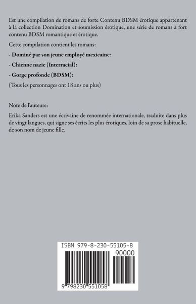 Est une compilation de romans de forte Contenu BDSM érotique appartenant à la collection Domination et soumission érotique, une série de romans à fort contenu BDSM romantique et érotique. Cette compilation contient les romans: - Dominé par son jeune employé mexicaine: - Chienne nazie (Interracial): - Gorge profonde (BDSM): (Tous les personnages ont 18 ans ou plus) Note de l'auteure: Erika Sanders est une écrivaine de renommée internationale, traduite dans plus de vingt langues, qui signe ses écrits les plus érotiques, loin de sa prose habituelle, de son nom de jeune fille.