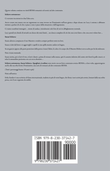 Questo volume contiene tre titoli BDSM romantici ed erotici ad alto contenuto. Schiavo sottomesso: Ci eravamo incontrati in chat l'altra sera. Avevo creato una stanza con un argomento su come trovare un Dominatrix nell'area giusta e dopo alcune ore Lucy è entrata e abbiamo iniziato a parlare di ciò che ci piace e non ci piace della situazione e dell'argomento. Ci siamo scambiati immagini ... niente di audace, inizialmente solo foto di noi in abbigliamento normale. Lucy quindi mi chiede di inviarle un elenco dei miei limiti ... un elenco completo di ciò che non avrei fatto e che cosa avrei voluto fare ... Susan Schiava: Susan adorava compiacere il suo Maestro e rendeva sempre perfetto tutto tra loro. Susan si alzò dal letto e si aggrovigliò i capelli in una spilla mentre andava in bagno. Su un gancio appeso alla parte posteriore della porta c'erano l'abito, le calze e le scarpe che il Maestro Robert aveva scelto per lei da indossare. Non c'erano mutande. Susan sorrise, poi si lavò il viso, si lavò i denti e, prima di tornare nella stanza, aprì il cassetto inferiore del comò, tirò fuori le palle cinesi e si tolse le mutandine perizoma con cui aveva dormito ... Schiavo sottomesso, Susan Schiava e Spogliati, ti ordino sono storie con un forte contenuto erotico BDSM e, a loro volta, appartengono anche alla raccolta Erotic Domination, una serie di romanzi ad alto contenuto BDSM. (Tutti i personaggi hanno 18 anni o più) Nota sull'autrice Erika Sanders è una scrittrice di fama internazionale, tradotta in più di venti lingue, che firma i suoi scritti più erotici, lontani dalla sua solita prosa, con il suo cognome da nubile.
