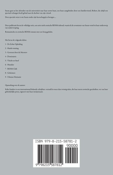 Susan gaat na het afronden van de universiteit naar haar eerste baan, een baan aangeboden door een familievriend, Robert, die altijd een speciaal verlangen heeft gehad naar de dochter van zijn vriend. Deze speciale wens is om Susan onder zijn heerschappij te brengen ... Deze publicatie bevat de volledige serie, een serie sterk erotische BDSM-inhoud, waarin ik de avonturen van Susan vertel in haar onderwerp van onderwerping. Romantische en erotische BDSM-romans met een hoog gehalte. Het bevat de volgende delen: 1 - De Echte Opleiding 2 - Harde training 3 - Gewenst door de Meesters 4 - Dominatrix 5 - Vlucht en Straf 6 - Huisdier 7 - BDSM Club 8 - Geheimen 9 - Ultieme Dminatie Opmerking over de auteur: Erika Sanders is een internationaal bekende schrijfster, vertaald in meer dan twintig talen, die haar meest erotische geschriften, ver van haar gebruikelijke proza, signeert met haar meisjesnaam.