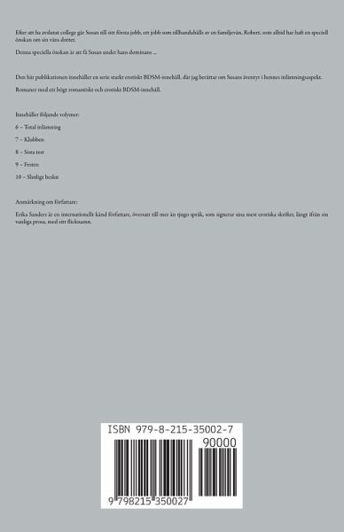 Efter att ha avslutat college går Susan till sitt första jobb, ett jobb som tillhandahålls av en familjevän, Robert, som alltid har haft en speciell önskan om sin väns dotter. Denna speciella önskan är att få Susan under hans dominans ... Den här publikationen innehåller en serie starkt erotiskt BDSM-innehåll, där jag berättar om Susans äventyr i hennes inlämningsaspekt. Romaner med ett högt romantiskt och erotiskt BDSM-innehåll. Innehåller följande volymer: 6 – Total inlämning 7 – Klubben 8 – Sista test 9 – Festen 10 – Slutligt beslut Anmärkning om författare: Erika Sanders är en internationellt känd författare, översatt till mer än tjugo språk, som signerar sina mest erotiska skrifter, långt ifrån sin vanliga prosa, med sitt flicknamn.