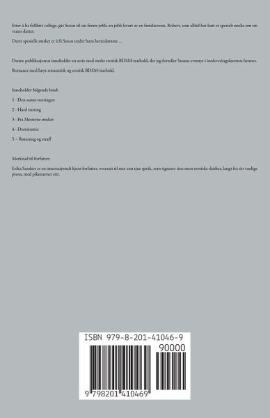 Etter å ha fullført college, går Susan til sin første jobb, en jobb levert av en familievenn, Robert, som alltid har hatt et spesielt ønske om sin venns datter. Dette spesielle ønsket er å få Susan under hans herredømme ... Denne publikasjonen inneholder en serie med sterkt erotisk BDSM-innhold, der jeg forteller Susans eventyr i innleveringsfasetten hennes. Romaner med høyt romantisk og erotisk BDSM-innhold. Inneholder følgende bind: 1 - Den sanne treningen 2 - Hard trening 3 - Fra Mesterne ønsket 4 - Dominatrix 5 – Rømning og straff Merknad til forfatter: Erika Sanders er en internasjonalt kjent forfatter, oversatt til mer enn tjue språk, som signerer sine mest erotiske skrifter, langt fra sin vanlige prosa, med pikenavnet sitt.
