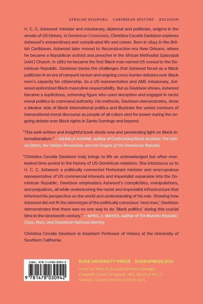 H. C. C. Astwood: minister and missionary, diplomat and politician, enigma in the annals of US history. In Dominican Crossroads, Christina Cecelia Davidson explores Astwood's extraordinary and complicated life and career. Born in 1844 in the British Caribbean, Astwood later moved to Reconstruction-era New Orleans, where he became a Republican activist and preacher in the African Methodist Episcopal (AME) Church. In 1882 he became the first Black man named US consul to the Dominican Republic. Davidson tracks the challenges that Astwood faced as a Black politician in an era of rampant racism and ongoing cross-border debates over Black men's capacity for citizenship. As a US representative and AME missionary, Astwood epitomized Black masculine respectability. But as Davidson shows, Astwood became a duplicitous, scheming figure who used deception and engaged in racist moral politics to command authority. His methods, Davidson demonstrates, show a bleaker side of Black international politics and illustrate the varied contours of transnational moral discourse as people of all colors vied for power during the ongoing debate over Black rights in Santo Domingo and beyond.
