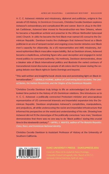 H. C. C. Astwood: minister and missionary, diplomat and politician, enigma in the annals of US history. In Dominican Crossroads, Christina Cecelia Davidson explores Astwood's extraordinary and complicated life and career. Born in 1844 in the British Caribbean, Astwood later moved to Reconstruction-era New Orleans, where he became a Republican activist and preacher in the African Methodist Episcopal (AME) Church. In 1882 he became the first Black man named US consul to the Dominican Republic. Davidson tracks the challenges that Astwood faced as a Black politician in an era of rampant racism and ongoing cross-border debates over Black men's capacity for citizenship. As a US representative and AME missionary, Astwood epitomized Black masculine respectability. But as Davidson shows, Astwood became a duplicitous, scheming figure who used deception and engaged in racist moral politics to command authority. His methods, Davidson demonstrates, show a bleaker side of Black international politics and illustrate the varied contours of transnational moral discourse as people of all colors vied for power during the ongoing debate over Black rights in Santo Domingo and beyond.