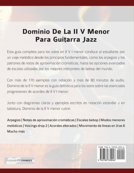Dominio de la ii V menor es la guía definitiva para los solos bebop en la ii V menor para guitarra. Pisándole los talones al libro éxito en ventas "Cambios fundamentales en la guitarra jazz", este libro profundiza en cada enfoque importante para los solos en la progresión de acordes ii V i menor. Partiendo de los principios básicos tales como arpegios de acordes, notas de aproximación cromáticas, arpegios extendidos y notas objetivo, Dominio de la ii V menor cubre los conceptos melódicos más emocionantes y avanzados que son utilizados por todos los grandes guitarristas de jazz bebop. Los capítulos en profundidad cubren el vocabulario esencial basado en el modo dominante frigio, la escala alterada, las sustituciones de arpegio y la escala eólica bebop.