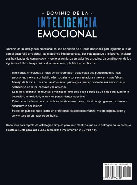 Dominio de la inteligencia emocional es una colección de 5 libros diseñados para ayudarlo a lidiar con el desarrollo emocional, las relaciones interpersonales, ser más atractivo e influyente, mejorar sus habilidades de comunicación y generar confianza en todos los aspectos. La combinación de los siguientes 5 libros le ayudará a alcanzar el éxito y la felicidad en la vida. · Inteligencia emocional: 21 días de transformación psicológica que pueden dominar sus emociones, mejorar sus habilidades sociales y construir relaciones mejores y más felices. · Manejo de la ira: 21 días de transformación psicológica pueden controlar sus emociones y deshacerse de la ira, el estrés y la ansiedad. · La terapia cognitivo-conductual simplificada: una guía paso a paso de 21 días para superar la depresión, la ansiedad, la ira y los pensamientos negativos · Estoicismo: La hermosa vida de la sabiduría eterna: desarrolla el coraje, genera confianza y encuentra la paz interior. · Hablar en público: hable como un profesional, desarrolle confianza, mejore la persuasión y conviértase en un maestro del habla. Cada libro está repleto de estrategias simples pero muy efectivas que se le entregan en un enfoque directo al punto para que pueda comenzar a implementar en su vida hoy.