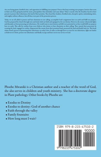 Are you facing giants, fortified cities, and opposition in fulfilling your purpose? Forces that keep resisting your progress, barriers that seem to limit you from going beyond the norm, principalities that intimidate and cause delays? That is exactly what the Israelites faced in their pursuit to possess their inheritance-the land of their promise. They faced the Anakites, fortified cities, deceptive spirits, intimidating rulers, and mighty military alliances, but all these were part of the possession process. Today, we are all called to possess and have dominion in our calling, accomplish God's assignments here on earth and fulfil our purpose. God has prepared his church through tests and trials, built our faith and equipped us for our destiny. However, the enemy vehemently fights and dissuades us from possessing our inheritance. He would want to steal, destroy and kill every potential in us that would fulfil our purpose here on earth. This calls for warfare from every believer who desires to have dominion in their calling. They started their possession by scouting the land, engaged in warfare, dispossessed the enemy from their promised land, possessed the land and finally had rest. This book relates Israel's process of possessing their inheritance to today's lives. It takes us through how to scout for our inheritance, fight our battles as believers in Christ, possess our inheritance and finally occupy and have rest in our service to God.