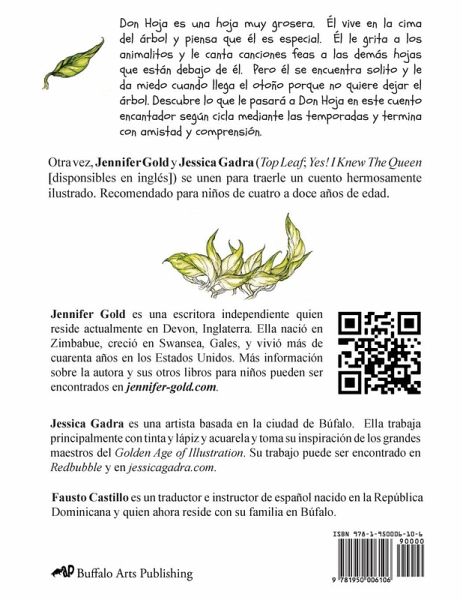 Don Hoja es una hoja muy grosera. Él vive en la cima del árbol y piensa que él es especial. Él le grita a los animalitos y le canta canciones feas a las demás hojas que están debajo de él. Pero él se encuentra solito y le da miedo cuando llega el otoño porque no quiere dejar el árbol. Descubre lo que le pasará a Don Hoja en este cuento encantador según cicla mediante las temporadas y termina con amistad y comprensión.