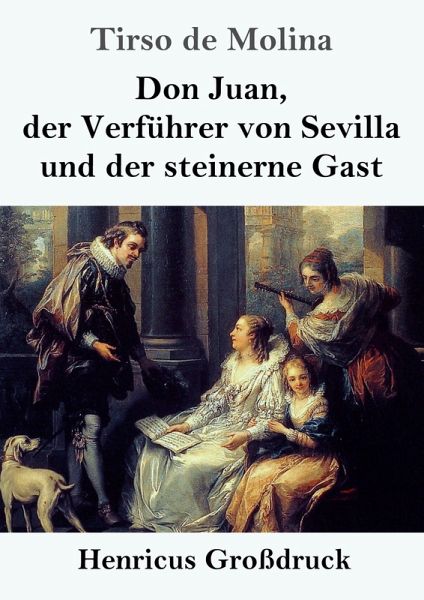Tirso de Molina: Don Juan, der Verführer von Sevilla und der steinerne Gast Lesefreundlicher Großdruck in 16-pt-Schrift Großformat, 210 x 297 mm Berliner Ausgabe, 2025 Durchgesehener Neusatz mit einer Biografie des Autors bearbeitet und eingerichtet von Theodor Borken Die Verfasserschaft ist nicht erwiesen. Inzwischen gilt sein Zeitgenosse Andrés de Claramonte (1580-1626) als Verfasser des Dramas. Uraufführung: Madrid, um 1624. Erstdruck anonym: Barcelona 1630. Hier nach der Übers. v. Ludwig Braunfels. Originaltitel: El Burlador de Sevilla y Convidado de Piedra. Textgrundlage ist die Ausgabe: Molina, Tirso de: Don Juan, der Verführer von Sevilla oder der steinerne Gast. In: Spanisches Theater, fünfter Band, übers. v. Ludwig Braunfels, Leipzig: Verlag des Bibliographischen Instituts, [o. J]. Dieses Buch folgt in Rechtschreibung und Zeichensetzung obiger Textgrundlage. Gesetzt aus der Minion Pro, 16 pt. Henricus - Edition Deutsche Klassik GmbH