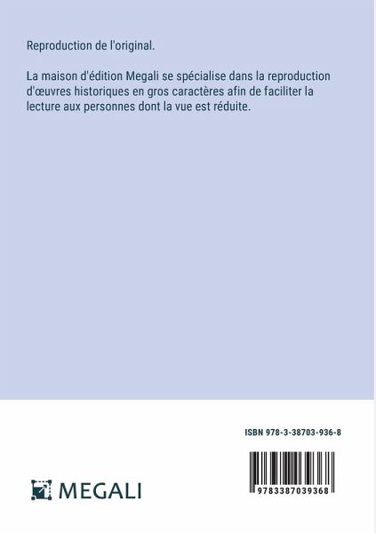 Reproduction de l'original. La maison d'édition Megali se spécialise dans la reproduction d'¿uvres historiques en gros caractères afin de faciliter la lecture aux personnes dont la vue est réduite.