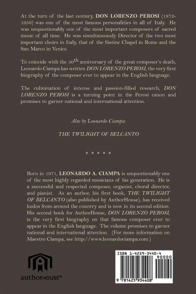 At the turn of the last century, DON LORENZO PEROSI (1872-1956) was one of the most famous personalities in all of Italy. He was unquestionably one of the most important composers of sacred music of all time. He was simultaneously Director of the two most important choirs in Italy, that of the Sistine Chapel in Rome and the San Marco in Venice. To coincide with the 50th anniversary of the great composer's death, Leonardo Ciampa has written DON LORENZO PEROSI, the very first biography of the composer ever to appear in the English language. The culmination of intense and passion-filled research, DON LORENZO PEROSI is a turning point in the Perosi canon and promises to garner national and international attention. Also by Leonardo Ciampa: THE TWILIGHT OF BELCANTO