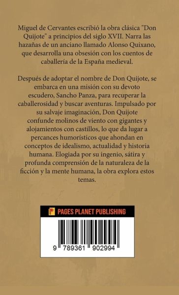 Miguel de Cervantes escribió la obra clásica "Don Quijote" a principios del siglo XVII. Narra las hazañas de un anciano llamado Alonso Quixano, que desarrolla una obsesión con los cuentos de caballería de la España medieval. Después de adoptar el nombre de Don Quijote, se embarca en una misión con su devoto escudero, Sancho Panza, para recuperar la caballerosidad y buscar aventuras. Impulsado por su salvaje imaginación, Don Quijote confunde molinos de viento con gigantes y alojamientos con castillos, lo que da lugar a percances humorísticos que ahondan en conceptos de idealismo, actualidad y historia humana. Elogiada por su ingenio, sátira y profunda comprensión de la naturaleza de la ficción y la mente humana, la obra explora estos temas.