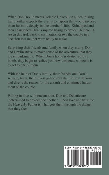 When Don Devlin meets Delanie Driscoll on a local hiking trail, neither expects the events to happen that would involve them far more deeply in one another's life. Kidnapped and then abandoned, Don is injured trying to protect Delanie. A seven day trek back to civilization draws the couple in a decision that neither were ready to make. Surprising their friends and family when they marry, Don and Devlin strive to make sense of the adventure that they are embarking on. When Don's home is destroyed by a bomb, they begin to realize just how desperate someone is to get to one of them. With the help of Don's family, their friends, and Don's security team, their investigation reveals just how devious and dire is the reason for the assault and continued harassment of the couple. Falling in love with one another, Don and Delanie are determined to protect one another. Their love and trust for the Heavenly Father is what gets them through the danger that they face.