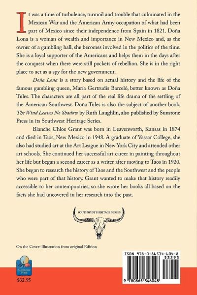 It was a time of turbulence, turmoil and trouble that culminated in the Mexican War and the American Army occupation of what had been part of Mexico since their independence from Spain in 1821. Doña Lona is a woman of wealth and importance in New Mexico and, as the owner of a gambling hall, she becomes involved in the politics of the time. She is a loyal supporter of the Americans and helps them in the days after the conquest when there were still pockets of rebellion. She is in the right place to act as a spy for the new government. "Doña Lona" is a story based on actual history and the life of the famous gambling queen, María Gertrudis Barceló, better known as Doña Tules. The characters are all part of the real life drama of the settling of the American Southwest. Doña Tules is also the subject of another book, "The Wind Leaves No Shadow" by Ruth Laughlin, also published by Sunstone Press in its Southwest Heritage Series. Blanche Chloe Grant was born in Leavenworth, Kansas in 1874 and died in Taos, New Mexico in 1948. A graduate of Vassar College, she also had studied art at the Art League in New York City and attended other art schools. She continued her successful art career in painting throughout her life but began a second career as a writer after moving to Taos in 1920. She began to research the history of Taos and the Southwest and the people who were part of that history. Grant wanted to make that history readily accessible to her contemporaries, so she wrote her books all based on the facts she had uncovered in her research into the past.