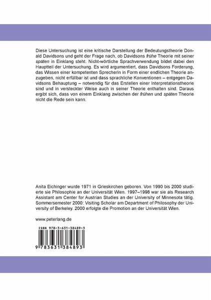 Diese Untersuchung ist eine kritische Darstellung der Bedeutungstheorie Donald Davidsons und geht der Frage nach, ob Davidsons frühe Theorie mit seiner späten in Einklang steht. Nicht-wörtliche Sprachverwendung bildet dabei den Hauptteil der Untersuchung. Es wird argumentiert, dass Davidsons Forderung, das Wissen einer kompetenten Sprecherin in Form einer endlichen Theorie anzugeben, nicht erfüllbar ist und dass sprachliche Konventionen - entgegen Davidsons Behauptung - notwendig für das Erstellen einer Interpretationstheorie sind und in versteckter Weise auch in seiner Theorie enthalten sind. Daraus ergibt sich, dass von einem Einklang zwischen der frühen und späten Theorie nicht die Rede sein kann.