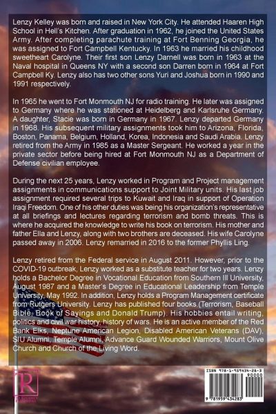 Lenzy Kelley was born and raised in New York City. He attended Haaren High School in Hell's Kitchen. After graduation in 1962, he joined the United States Army. After completing parachute training at Fort Benning Georgia, he was assigned to Fort Campbell Kentucky. In 1963 he married his childhood sweetheart Carolyne. Their first son Lenzy Darnell was born in 1963 at the Naval hospital in Queens NY with a second son Darren born in 1964 at Fort Campbell Ky. Lenzy also has two other sons Yuri and Joshua born in 1990 and 1991 respectively. In 1965 he went to Fort Monmouth NJ for radio training. He later was assigned to Germany where he was stationed at Heidelberg and Karlsruhe Germany. A daughter, Stacie was born in Germany in 1967. Lenzy departed Germany in 1968. His subsequent military assignments took him to Arizona, Florida, Boston, Panama, Belgium, Holland, Korea, Indonesia and Saudi Arabia. Lenzy retired from the Army in 1985 as a Master Sergeant. He worked a year in the private sector before being hired at Fort Monmouth NJ as a Department of Defense civilian employee. During the next 25 years, Lenzy worked in Program and Project management assignments in communications support to Joint Military units. His last job assignment required several trips to Kuwait and Iraq in support of Operation Iraqi Freedom. One of his other duties was being his organization's representative at all briefings and lectures regarding terrorism and bomb threats. This is where he acquired the knowledge to write his book on terrorism. His mother and father Ella and Lenzy, along with two brothers are deceased. His wife Carolyne passed away in 2006. Lenzy remarried in 2016 to the former Phyllis Ling. Lenzy retired from the Federal service in August 2011. However, prior to the COVID-19 outbreak, Lenzy worked as a substitute teacher for two years. Lenzy holds a Bachelor Degree in Vocational Education from Southern Ill University, August 1987 and a Master's Degree in Educational Leadership from Temple University, May 1992. In addition, Lenzy holds a Program Management certificate from Rutgers University. Lenzy has published four books. (Terrorism, Baseball Bible, Book of Sayings and Donald Trump). His hobbies entail writing, politics and civil war history, history of wars. He is an active member of the Red Bank Elks, Neptune American Legion, Disabled American Veterans (DAV), SIU Alumni, Temple Alumni, Advance Guard Wounded Warriors, Mount Olive Church and Church of the Living Word.