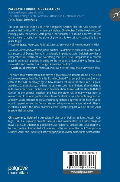 The state of New Hampshire has played a pivotal role in Donald Trump's rise. This volume examines how the Granite State incubated Trump's political ambitions as early as the 1988 campaign cycle, how Trump's return to the state in 2014 presaged his 2016 candidacy, and how the state rescued his ambitions after his defeat in the Iowa caucuses. The book also examines how Trump lost the state to Hillary Clinton in the general election, and how the state has in many ways been a microcosm of national politics since Trump's election, as a Republican governor and legislature attempt to pursue their long-deferred agenda in the face of Democratic opposition and as Democrats racked up victories in special and off-year elections. Finally, this book examines what Trump's impact will be on the 2020 presidential primaries.