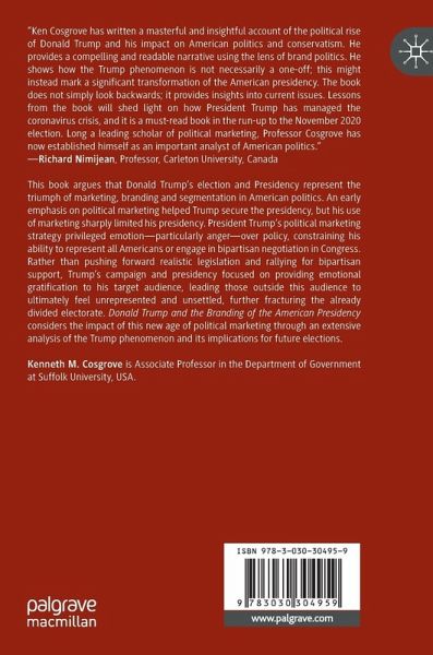 This book argues that Donald Trump's election and Presidency represent the triumph of marketing, branding and segmentation in American politics. An early emphasis on political marketing helped Trump secure the presidency, but his use of marketing sharply limited his presidency. President Trump's political marketing strategy privileged emotion-particularly anger-over policy, constraining his ability to represent all Americans or engage in bipartisan negotiation in Congress. Rather than pushing forward realistic legislation and rallying for bipartisan support, Trump's campaign and presidency focused on providing emotional gratification to his target audience, leading those outside this audience to ultimately feel unrepresented and unsettled, further fracturing the already divided electorate. Donald Trump and the Branding of the American Presidency considers the impact of this new age of political marketing through an extensive analysis of the Trump phenomenon and its implications for future elections.
