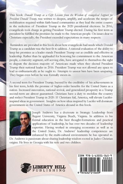 This book: Donald Trump as a Gift: Lessons from the Wisdom of evangelical Support for President Donald Trump, was written to deepen, amplify, and accelerate the tempo of mobilization required within faith-based communities as they lead the entire country in the reelection of President Trump in the 2020 presidential elections. In 2016, evangelicals took charge in getting President Trump elected. During his first term as president he fulfilled the promises he made to the American people. On issues dear to Christians especially; the President exceeded expectations in many respects. Reminders are provided in this book about how evangelicals had needs which Donald Trump as a candidate was the best fit to address. A rational evaluation of the ability to keep his promises as a leader stands President Trump out as credible and effective in leadership. Rather than be applauded for honoring his commitment to the American people, a minority segment; self-serving elite, have arrogated to themselves the right to dispute the decision majority of Americans made when they elected President Trump their national leader in 2016. President Trump was not allowed any space to lead as enthusiastically as he ought to. Attempts to unseat him have been unsparing. They began even before he was formally sworn in. A second term for President Trump; buoyed by the credibility of his achievements in his first term, holds the promise of higher-order benefits for the United States as a nation. Increased innovation, national revival, and generalized prosperity in a Trump second-term are almost guaranteed. Christians have a duty to mobilize the country and reelect President Trump in 2020. If Christians fail, America, will elevate Lucifer-inspired ideas in government. Insights on how ideas inspired by Lucifer will dominate governments in the United States of America abound in this book. Joseph Andrews has a doctorate in Strategic Leadership from Regent University, Virginia Beach, Virginia. In addition to his formal education in the best thought-formations and practical applications of leadership, he has over two decades of leadership expertise. Having worked in emerging economies as well as in the United States, Dr. Andrews' leadership competences are enhanced by the multi-cultural environments he has operated in. Dr. Andrews is passionate about sharing leadership wisdom rooted in Judeo-Christian origins. He lives in Georgia with his wife and two children.