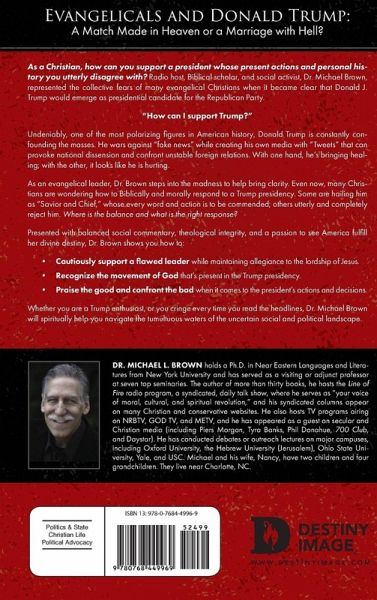 Evangelicals and Donald Trump: A Match Made in Heaven or a Marriage with Hell? As a Christian, how can you support a president whose present actions and personal history you utterly disagree with? Radio host, Biblical scholar, and social activist, Dr. Michael Brown, represented the collective fears of many evangelical Christians when it became clear that Donald J. Trump would emerge as presidential candidate for the Republican Party. "How can I support Trump?" Undeniably, one of the most polarizing figures in American history, Donald Trump is constantly confounding the masses. He wars against "fake news" while creating his own media with "Tweets" that can provoke national dissension and confront unstable foreign relations. With one hand, he’s bringing healing; with the other, it looks like he is hurting. As an evangelical leader, Dr. Brown steps into the madness to help bring clarity. Even now, many Christians are wondering how to Biblically and morally respond to a Trump presidency. Some are hailing him as "Savior and Chief," whose every word and action is to be commended; others utterly and completely reject him. Where is the balance and what is the right response? Presented with balanced social commentary, theological integrity, and a passion to see America fulfill her divine destiny, Dr. Brown shows you how to: Cautiously support a flawed leader while maintaining allegiance to the lordship of Jesus. Recognize the movement of God that’s present in the Trump presidency. Praise the good and confront the bad when it comes to the president’s actions and decisions. Whether you are a Trump enthusiast, or you cringe every time you read the headlines, Dr. Michael Brown will spiritually help you navigate the tumultuous waters of the uncertain social and political landscape.