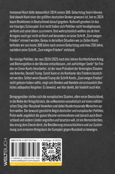 Immanuel Kant hätte bekanntlich 2024 seinen 300. Geburtstag feiern können. Und obwohl Kant einer der größten deutschen Denker gewesen ist, hat es 2024 kaum Reaktionen in Deutschland darauf gegeben. Kulturell gesehen ist das ein trauriges Schauspiel. Erst recht haben sich Politiker nicht herabgelassen, an Kant und seine Ideen zu erinnern. Und wahrscheinlich wollten sie ob ihrer Arroganz auch gar nicht an Kant und besonders an seine Schrift "Zum ewigen Frieden" erinnert werden. Genau in derselben Situation wie zu Zeiten Kants befinden wir uns heute 300 Jahre nach seinem Geburtstag und etwa 250 Jahre, nachdem seine Schrift "Zum ewigen Frieden" entstand. Der einzige Politiker, der nun 2024/2025 nach drei Jahren fürchterlichem Krieg und Blutvergießen in der Ukraine entschlossen "mit aufrichtiger Seele" für Frieden im Sinne Kants hinarbeitet, ist der neue Präsident der Vereinigten Staaten von Amerika, Donald Trump. Somit kann er als Kantianer des Friedens bezeichnet werden. Selbst wennDonald Trump die Schrift Kants "Zum ewigen Frieden" nicht gelesen haben sollte, zeigt sein Denken und Handeln ein erstaunlich ähnliches adäquates Vorgehen. Es beweist, wer klar denkt, der handelt auch klar.Demgegenüber stellen sich die europäischen Staaten, allen voran Deutschland, in die Reihe der Kriegsfürsten, die vollkommen unrealistisch auf einen militäri-schen Sieg über Russland hinwirken und dabei Hundertausende Menschen opfern wollen. Die bewusst geschürte Angst deutscher und europäischer Politiker, Putin wolle angeblich die ganze Ukraine vereinnahmen und danach auch Deutschland und andere Länder angreifen und besetzen will, ist ein Horrormärchen, das einzig dem Zweck dient, die Bevölkerung einzuschüchtern und zur Zustimmung zum erneuten Kriegskurs der Europäer gegen Russland zu bewegen.