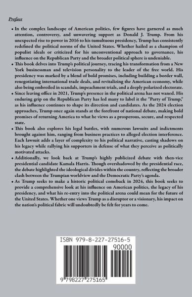 Preface In the complex landscape of American politics, few figures have garnered as much attention, controversy, and unwavering support as Donald J. Trump. From his unexpected rise to power in 2016 to his tumultuous presidency, Trump has consistently redefined the political norms of the United States. Whether hailed as a champion of populist ideals or criticized for his unconventional approach to governance, his influence on the Republican Party and the broader political sphere is undeniable. This book delves into Trump's political journey, tracing his transformation from a New York businessman and television personality to the leader of the free world. His presidency was marked by a blend of bold promises, including building a border wall, renegotiating international trade deals, and revitalizing the American economy, while also being embroiled in scandals, impeachment trials, and a deeply polarized electorate. Since leaving office in 2021, Trump's presence in the political arena has not waned. His enduring grip on the Republican Party has led many to label it the "Party of Trump," as his influence continues to shape its direction and candidates. As the 2024 election approaches, Trump once again stands at the forefront of national debate, making bold promises of returning America to what he views as a prosperous, secure, and respected state. This book also explores his legal battles, with numerous lawsuits and indictments brought against him, ranging from business practices to alleged election interference. Each lawsuit adds a layer of complexity to his political narrative, casting shadows on his legacy while rallying his supporters in defense of what they perceive as politically motivated attacks. Additionally, we look back at Trump's highly publicized debate with then-vice presidential candidate Kamala Harris. Though overshadowed by the presidential race, the debate highlighted the ideological divides within the country, reflecting the broader clash between the Trumpian worldview and the Democratic Party's agenda. As Trump seeks to make a historic political comeback in 2024, this book seeks to provide a comprehensive look at his influence on American politics, the legacy of his presidency, and what his re-entry into the political arena could mean for the future of the United States. Whether one views Trump as a disruptor or a visionary, his impact on the nation's political fabric will undoubtedly be felt for years to come.
