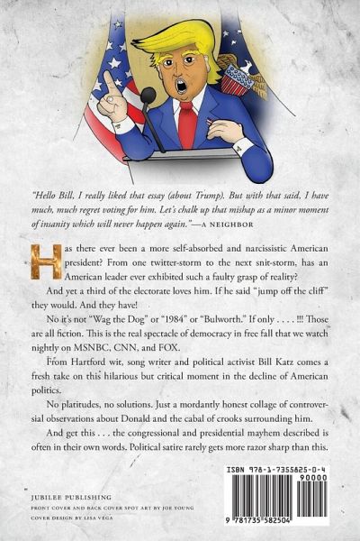 DONALD'S VANITY TANTRUMS Has there ever been a more self-absorbed and narcissistic American president? From one twitter-storm to the next snit-storm, has an American leader ever exhibited such a faulty grasp of reality? And yet a third of the electorate loves him. If he said "jump off the cliff" they would. And they have! No it's not "Wag the Dog" or "1984" or "Bulworth". If only ...!!! Those are all fiction. This is the real spectacle of democracy in free fall that we watch nightly on MSNBC, CNN, and FOX. From Hartford wit, song writer and political activist Bill Katz comes a fresh take on this hilarious but critical moment in the decline of American politics. No platitudes, no solutions. Just a mordantly honest collage of controversial observations about Donald and the cabal of crooks surrounding him. And get this ... the congressional and presidential mayhem described is often in their own words. Political satire rarely gets more razor sharp than this.