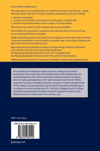 In this monograph, we de?ne and investigate an algebro-geometric analogue of Donaldson invariants by using moduli spaces of semistable sheaves with arbitrary ranks on a polarized projective surface. We may expect the existence of interesting "universal relations among invariants", which would be a natural generalization of the "wall-crossing formula" and the "Witten conjecture" for classical Donaldson invariants. Our goal is to obtain a weaker version of such relations, in other brief words, to describe a relation as the sum of integrals over the products of m- uli spaces of objects with lower ranks. Fortunately, according to a recent excellent work of L. Gottsche, ¨ H. Nakajima and K. Yoshioka, [53], a wall-crossing formula for Donaldson invariants of projective surfaces can be deduced from such a weaker result in the rank two case. We hope that our work in this monograph would, at least tentatively, provides a part of foundation for the further study on such universal relations. In the rest of this preface, we would like to explain our motivation and some of important ingredients of this study. See Introduction for our actual problems and results. Donaldson Invariants Let us brie?y recall Donaldson invariants. We refer to [22] for more details and precise. We also refer to [37], [39], [51] and [53]. LetX be a compact simply con- ? nected oriented real 4-dimensional C -manifold with a Riemannian metric g. Let P be a principalSO(3)-bundle on X.