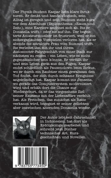 Der Physik-Student Kaspar liebt klare Strukturen. Er denkt und handelt logisch, sein Alltag ist geregelt und sein Studium steht kurz vor dem Abschluss (Diplomthema: »Raum und Zeit«), eine Karriere zeichnet sich ab. Bis er Donatella trifft - oder sie auf ihn. Der begeisterte Amateurmusiker ist frustriert, weil er ein sichergeglaubtes Vorspielen verloren hat, als er abends die attraktive Frau vom Rummel trifft. Sie verleitet ihn mit ihr und ihrem Autoscooter-Fahrgeschäft von einer Stadt zur nächsten zu reisen, ein Leben, wie es nicht gegensätzlicher sein könnte. Er verfällt ihr und sein Leben gerät aus den Fugen. Kaspar endet schließlich als Pausenclown beim Zirkus, wo er durch ein Raubtier einen gewaltsam den Tod findet, der sich durch seltsame Ereignisse angekündigt hat. Kaspar kommt ins Jenseits, wo gerade das Computersystem modernisiert wird und erhält dort die Chance zur Wiedergeburt, da er das vorgesehene Ziel seiner Existenz mit der Liebesaffäre verfehlt hat. Als Frettchen, das zunächst als Ratte verkannt wird, begegnet er seiner geliebten aber inzwischen alternden Donatella wieder.