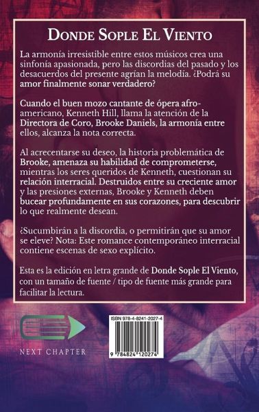 La armonía irresistible entre estos músicos crea una sinfonía apasionada, pero las discordias del pasado y los desacuerdos del presente agrían la melodía. ¿Podrá su amor finalmente sonar verdadero? Cuando el buen mozo cantante de ópera afro-americano, Kenneth Hill, llama la atención de la Directora de Coro, Brooke Daniels, la armonía entre ellos, alcanza la nota correcta. Al acrecentarse su deseo, la historia problemática de Brooke, amenaza su habilidad de comprometerse, mientras los seres queridos de Kenneth, cuestionan su relación interracial. Destruidos entre su creciente amor y las presiones externas, Brooke y Kenneth deben bucear profundamente en sus corazones, para descubrir lo que realmente desean. ¿Sucumbirán a la discordia, o permitirán que su amor se eleve? Nota: Este romance contemporáneo interracial contiene escenas de sexo explícito. Esta es la edición en letra grande de Donde Sople El Viento, con una fuente / tipo de letra más grande para facilitar la lectura.
