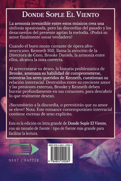 La armonía irresistible entre estos músicos crea una sinfonía apasionada, pero las discordias del pasado y los desacuerdos del presente agrían la melodía. ¿Podrá su amor finalmente sonar verdadero? Cuando el buen mozo cantante de ópera afro-americano, Kenneth Hill, llama la atención de la Directora de Coro, Brooke Daniels, la armonía entre ellos, alcanza la nota correcta. Al acrecentarse su deseo, la historia problemática de Brooke, amenaza su habilidad de comprometerse, mientras los seres queridos de Kenneth, cuestionan su relación interracial. Destruidos entre su creciente amor y las presiones externas, Brooke y Kenneth deben bucear profundamente en sus corazones, para descubrir lo que realmente desean. ¿Sucumbirán a la discordia, o permitirán que su amor se eleve? Nota: Este romance contemporáneo interracial contiene escenas de sexo explícito. Esta es la edición en letra grande de Donde Sople El Viento, con una fuente / tipo de letra más grande para facilitar la lectura.