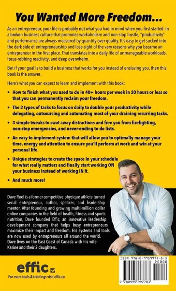 You Wanted More Freedom... As an entrepreneur, being your own boss is probably not what you had in mind when you first started. In a broken business culture that promotes workaholism and non-stop hustle, where productivity and performance are measured by quantity over quality, it's easy to get sucked into the dark side of entrepreneurship and lose sight of the very reasons why you became an entrepreneur in the first place. That translates into a daily life of unmanageable workloads, focus-robbing reactivity, and deep overwhelm. But if your goal is to build a business that works for you instead of enslaving you, then this book is the answer. Here's what you can expect to learn and implement with this book: How to finish what you used to do in 40+ hours per week in 20 hours or less. The 2 types of tasks to focus on daily to double your productivity while delegating, outsourcing and automating most of your draining recurring tasks. 3 simple tweaks to swat away distractions and free you from firefighting, non-stop emergencies, and never-ending to-do lists. An easy to implement system that will allow you to optimally manage your time, energy and attention to ensure you'll perform at work and win at your personal life. Unique strategies to create the space in your schedule for what really matters. And much more! Dave Ruel is a former competitive physique athlete turned serial entrepreneur, author, speaker, and leadership mentor. After founding and growing multi-million dollar online companies in the field of health, fitness and sports nutrition, Dave founded Effic, an innovative leadership development company that helps busy entrepreneurs maximize their impact and freedom. His systems and tools are now used by entrepreneurs all around the world. Dave lives on the East Coast of Canada with his wife Karine and their 2 daughters.