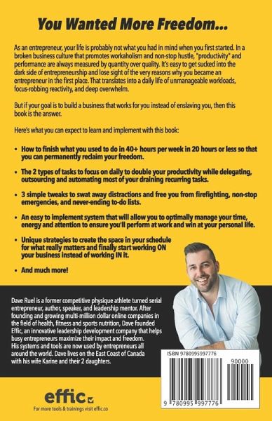 You Wanted More Freedom... As an entrepreneur, being your own boss is probably not what you had in mind when you first started. In a broken business culture that promotes workaholism and non-stop hustle, where productivity and performance are measured by quantity over quality, it's easy to get sucked into the dark side of entrepreneurship and lose sight of the very reasons why you became an entrepreneur in the first place. That translates into a daily life of unmanageable workloads, focus-robbing reactivity, and deep overwhelm. But if your goal is to build a business that works for you instead of enslaving you, then this book is the answer. Here's what you can expect to learn and implement with this book: * How to finish what you used to do in 40+ hours per week in 20 hours or less. * The 2 types of tasks to focus on daily to double your productivity while delegating, outsourcing and automating most of your draining recurring tasks. * 3 simple tweaks to swat away distractions and free you from firefighting, non-stop emergencies, and never-ending to-do lists. * An easy to implement system that will allow you to optimally manage your time, energy and attention to ensure you'll perform at work and win at your personal life. * Unique strategies to create the space in your schedule for what really matters. * And much more! Dave Ruel is a former competitive physique athlete turned serial entrepreneur, author, speaker, and leadership mentor. After founding and growing multi-million dollar online companies in the field of health, fitness and sports nutrition, Dave founded Effic, an innovative leadership development company that helps busy entrepreneurs maximize their impact and freedom. His systems and tools are now used by entrepreneurs all around the world. Dave lives on the East Coast of Canada with his wife Karine and their 2 daughters. What people are saying "Dave's methods have impacted our businesses so much in such a short amount of time... However, it all boils down to this: what we implemented took our business from behind-the-scenes chaos that felt messy, reactive and stressful to run to one that is simplified, streamlined and ENJOYABLE again. We can't thank you enough Dave for what you've created with this system. It's changed the way we run our business AND our team!" - Jill & Josh Stanton ScrewTheNineToFive.com "I've tried dozens of organizational systems in the past, but most of them have fallen short... Each time I used them they all seemed to be either lacking what I truly needed as a busy professional or they were too hard to implement. I'm now in perfect control of my quarterly, weekly, and daily planning." - Dr. Stephen Cabral Cabral Wellness Institute "As a busy father and entrepreneur, I am always trying to optimize my daily routine and the systems in my business to allow me to do the things I love. If you don't know Dave, he is a Jedi Master of creating systems and leveraging your strengths. And because of that, he instantly taught me how to leverage my skills to get the most out of my time and in turn has helped make me more productive and effective as a leader, content creator and businessman. As a classic small business owner and procrastinator, I used to have a tendency to get overwhelmed with what I want to accomplish as far as growth and big goals are concerned. What you'll find in this book has helped me clarify my vision and big goals and create a roadmap of smaller, bite-sized tasks to allow me to achieve the life and business of my dreams. Now, I'm able to work 5 hours per day and enjoy more time being present with my wife and 5 kids without having my mind wandering over to business issues anymore." - Chris Lopez Online Entrepreneur