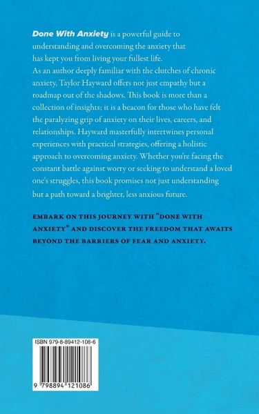 "Incredibly helpful resource for people struggling with anxiety. The author ties together important healing information in a comprehensive and easy to read format." ~ Liz Fultz, Licensed Professional Clinical Counselor "Describes in a fresh way how anxiety works and will open doors to those suffering from anxiety to fuller life." ~ Charles F. Herr, Clinical Psychologist, Ph.D. "The book is a great way for people with anxiety to have an author express their own vulnerabilities and tactics that assist with ways to overcome anxiety! It's especially beneficial for those who are unable to access therapy or formal interventions that can still get an understanding of the impacts, symptoms, underlying root causes, and coping tools!" ~ Cristina Oliver, LCSW, MSW Done With Anxiety is a powerful guide to understanding and overcoming the anxiety that has kept you from living your fullest life. As an author deeply familiar with the clutches of chronic anxiety, Taylor Hayward offers not just empathy but a roadmap out of the shadows. This book is more than a collection of insights; it is a beacon for those who have felt the paralyzing grip of anxiety on their lives, careers, and relationships. Hayward masterfully intertwines personal experiences with practical strategies, offering a holistic approach to overcoming anxiety. Whether you're facing the constant battle against worry or seeking to understand a loved one's struggles, this book promises not just understanding but a path toward a brighter, less anxious future. Embark on this journey with "Done With Anxiety" and discover the freedom that awaits beyond the barriers of fear and anxiety.