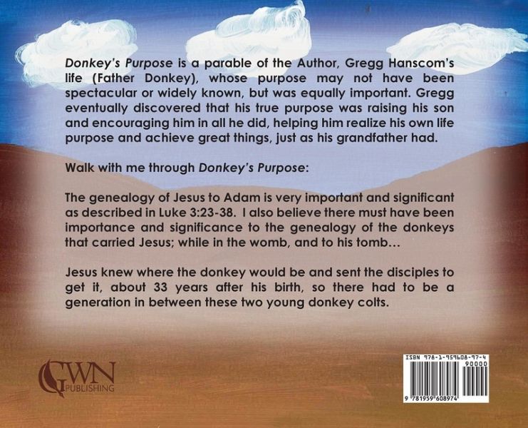Donkey's Purpose is a parable of the Author, Gregg Hanscom's life (Father Donkey), whose purpose may not have been spectacular or widely known, but was equally important. Gregg eventually discovered that his true purpose was raising his son and encouraging him in all he did, helping him realize his own life purpose and achieve great things, just as his grandfather had. Walk with me through Donkey's Purpose: The genealogy of Jesus to Adam is very important and significant as described in Luke 3:23-38. I also believe there must have been importance and significance to the genealogy of the donkeys that carried Jesus; while in the womb, and to his tomb... Jesus knew where the donkey would be and sent the disciples to get it, about 33 years after his birth, so there had to be a generation in between these two young donkey colts.