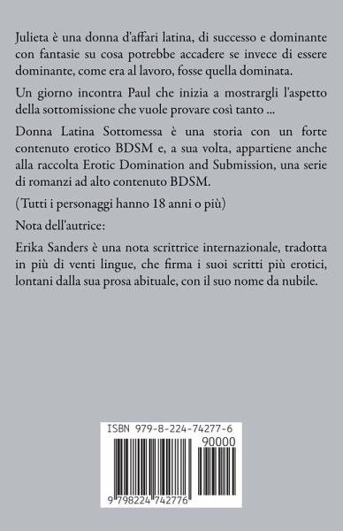 Julieta è una donna d'affari latina, di successo e dominante con fantasie su cosa potrebbe accadere se invece di essere dominante, come era al lavoro, fosse quella dominata. Un giorno incontra Paul che inizia a mostrargli l'aspetto della sottomissione che vuole provare così tanto ... Donna Latina Sottomessa è una storia con un forte contenuto erotico BDSM e, a sua volta, appartiene anche alla raccolta Erotic Domination and Submission, una serie di romanzi ad alto contenuto BDSM. (Tutti i personaggi hanno 18 anni o più) Nota dell'autrice: Erika Sanders è una nota scrittrice internazionale, tradotta in più di venti lingue, che firma i suoi scritti più erotici, lontani dalla sua prosa abituale, con il suo nome da nubile.