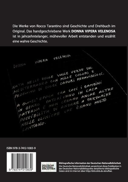 Die Werke von Rocco Tarantino sind Geschichte und Drehbuch im Original. Das handgeschriebene Werk Donna Vipera Velenosa ist in jahrzehntelanger, mühevoller Arbeit entstanden und erzählt eine wahre Geschichte.