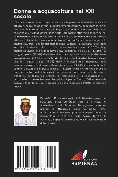 Lo studio è stato condotto per determinare la partecipazione delle donne alle attività di pesca come mezzo di sostentamento nell'area di governo locale di Doma, nello Stato di Nasarawa, in Nigeria. Un totale di sessanta (60) donne coinvolte in attività di pesca sono state selezionate attraverso la tecnica del campionamento mirato nell'area di studio. I dati primari sono stati raccolti attraverso l'uso di un questionario strutturato e un'intervista personale alle intervistate. Per l'analisi dei dati è stata utilizzata la statistica descrittiva semplice. I risultati dello studio hanno mostrato che il 33,3% degli intervistati aveva un'età produttiva attiva compresa tra i 31 e i 40 anni. La maggior parte (63,3%) degli intervistati era sposata e circa (40%) aveva un'esperienza di 6-10 anni nelle attività di pesca. I risultati hanno indicato che la maggior parte (33,35) degli intervistati era impegnata nella commercializzazione di pesce affumicato, mentre il 26,7% era coinvolto nella commercializzazione di pesce fresco. I risultati hanno inoltre rivelato che la maggior parte degli intervistati non spende nemmeno un kobo per il trasporto, la legna da ardere, la riparazione e la manutenzione, il carburante, il pesce lavorato, l'acquisto di pesce fresco, l'attrezzatura da pesca, il frigorifero, il refrigeratore, i bidoni, le ciotole e l'affitto di terreni e negozi.