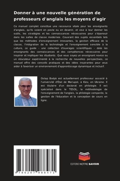 Ce manuel complet constitue une ressource vitale pour les enseignants d'anglais, qu'ils soient en poste ou en devenir, et vise à leur donner les outils, les stratégies et les connaissances nécessaires pour s'épanouir dans les salles de classe modernes. Couvrant des sujets essentiels tels que les méthodes d'enseignement innovantes, la gestion efficace de la classe, l'intégration de la technologie et l'enseignement sensible à la culture, ce guide - une collection d'ouvrages scientifiques - dote les enseignants des connaissances et des compétences nécessaires pour inspirer et impliquer les étudiants. Que vous soyez un enseignant novice ou un éducateur expérimenté à la recherche de nouvelles perspectives, ce manuel offre des conseils pratiques et des idées inspirantes pour vous aider à favoriser un environnement d'apprentissage dynamique et inclusif.