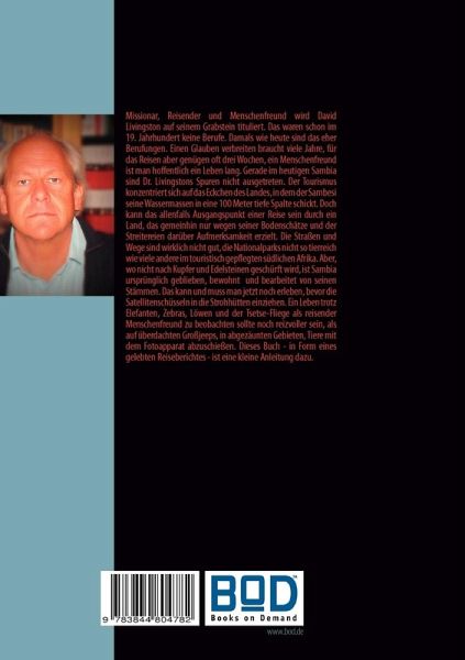 Missionar, Reisender und Menschenfreund wird David Livingston auf seinem Grabstein tituliert. Das waren schon im 19. Jahrhundert keine Berufe. Damals wie heute sind das eher Berufungen. Einen Glauben verbreiten braucht viele Jahre, für das Reisen aber genügen oft drei Wochen, ein Menschenfreund ist man hoffentlich ein Leben lang. Gerade im heutigen Sambia sind Dr. Livingstons Spuren nicht ausgetreten. Der Tourismus konzentriert sich auf das Eckchen des Landes, in dem der Sambesi seine Wassermassen in eine 100 Meter tiefe Spalte schickt. Doch kann das allenfalls Ausgangspunkt einer Reise sein durch ein Land, das gemeinhin nur wegen seiner Bodenschätze und der Streitereien darüber Aufmerksamkeit erzielt. Die Straßen und Wege sind wirklich nicht gut, die Nationalparks nicht so tierreich wie viele andere im touristisch gepflegten südlichen Afrika. Aber, wo nicht nach Kupfer und Edelsteinen geschürft wird, ist Sambia ursprünglich geblieben, bewohnt und bearbeitet von seinen Stämmen. Das kann und muss man jetzt noch erleben, bevor die Satellitenschüsseln in die Strohhütten einziehen. Ein Leben trotz Elefanten, Zebras, Löwen und der Tsetse-Fliege als reisender Menschenfreund zu beobachten sollte noch reizvoller sein, als auf überdachten Großjeeps, in abgezäunten Gebieten, Tiere mit dem Fotoapparat abzuschießen. Dieses Buch - in Form eines gelebten Reiseberichtes - ist eine kleine Anleitung dazu.