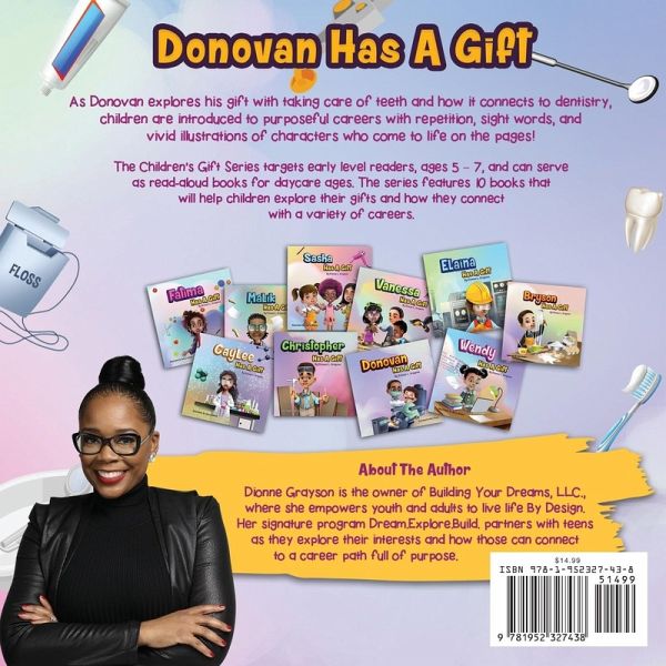 As Donovan explores his gift with taking care of teeth and how it connects to dentistry, children are introduced to purposeful careers with repetition, sight words, and vivid illustrations of characters who come to life on the pages! The Children's Gift Series targets early level readers, K - 2 grade and can serve as read-aloud books for daycare ages. The series features 10 books that help children explore gifts and how they connect with a variety of attainable careers. From baking and styling hair, to writing and working with animals, this series partners with children as they are learning to read and challenges each young mind to comprehend how unique his or her gift is. Repetition across all 10 books builds confidence with children and encourages reading.